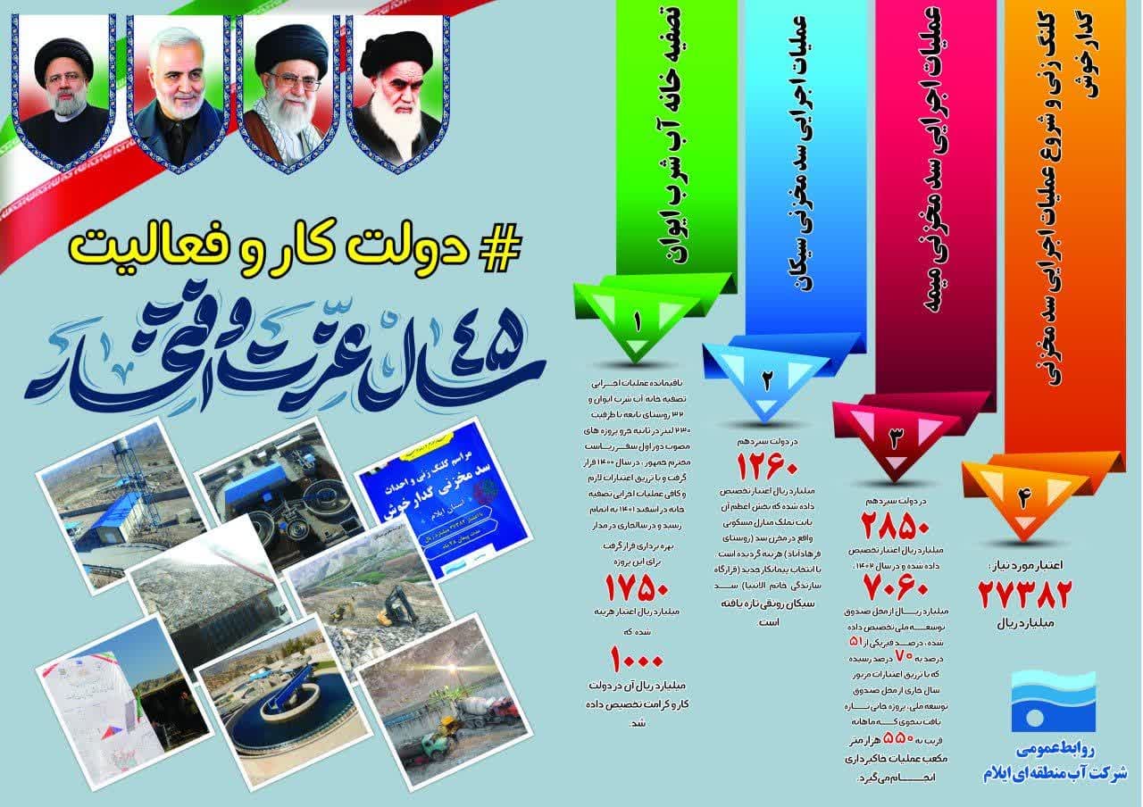 – تکمیل پروژه تصفیه خانه آب شرب ایوان با اعتبار هزینه شده ۱۷۵۰ میلیارد ریال که بیش از ۱۰۰۰ میلیارد آن در دولت کار و کرامت تخصیص داده شد.